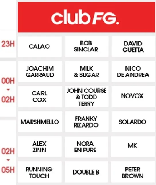 Les jeudis, vendredis et samedis, les meilleurs DJ de la planète, mixent en exclusivité sur RADIO FG… Jusqu’au bout de la nuit, c’est CLUB FG.