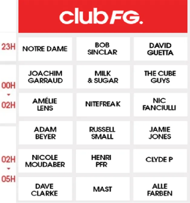 Les jeudis, vendredis et samedis, les meilleurs DJ de la planète, mixent en exclusivité sur RADIO FG… Jusqu’au bout de la nuit, c’est CLUB FG.