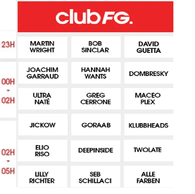 Les jeudis, vendredis et samedis, les meilleurs DJ de la planète, mixent en exclusivité sur RADIO FG… Jusqu’au bout de la nuit, c’est CLUB FG.