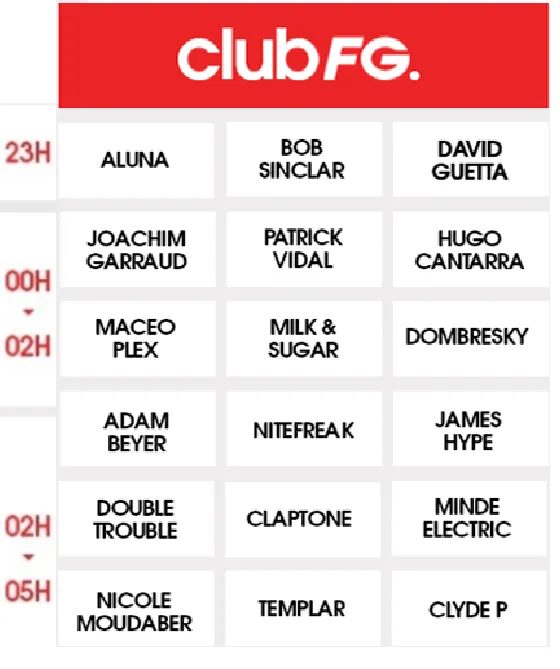 Les jeudis, vendredis et samedis, les meilleurs DJ de la planète mixent en exclusivité sur RADIO FG… Jusqu’au bout de la nuit, c’est CLUB FG.