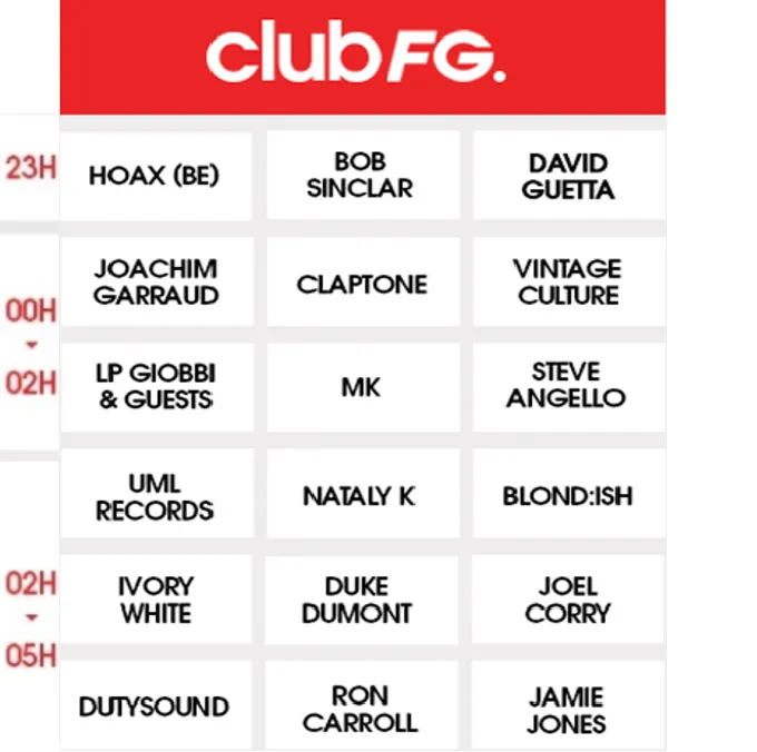 Les jeudis, vendredis et samedis, les meilleurs DJ de la planète mixent en exclusivité sur RADIO FG… Jusqu’au bout de la nuit, c’est CLUB FG.