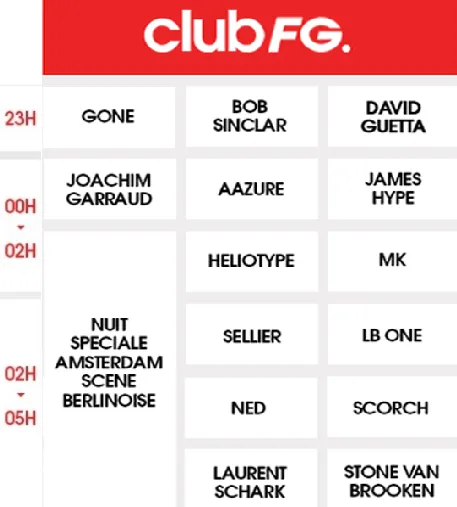 Les jeudis, vendredis et samedis, les meilleurs DJ de la planète, mixent en exclusivité sur RADIO FG… Jusqu’au bout de la nuit, c’est CLUB FG.