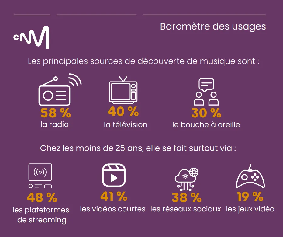 Aujourd’hui, les réseaux sociaux servent aussi de support pour écouter de la musique, notamment grâce à TikTok. 43% des personnes qui écoutent de la musique le font via les réseaux et les vidéos courtes, comme les réels et shorts YouTube.
