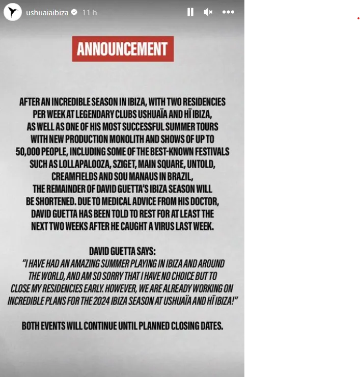 Une annonce accompagnée d’un message de David Guetta : "J'ai passé un été incroyable à jouer à Ibiza et dans le monde entier, et je suis vraiment désolé de n'avoir d'autres choix que de fermer mes résidences plus tôt." L’artiste se veut optimiste et renvoie à la saison 2024 d’Ibiza qu’il commencerait déjà à préparer.