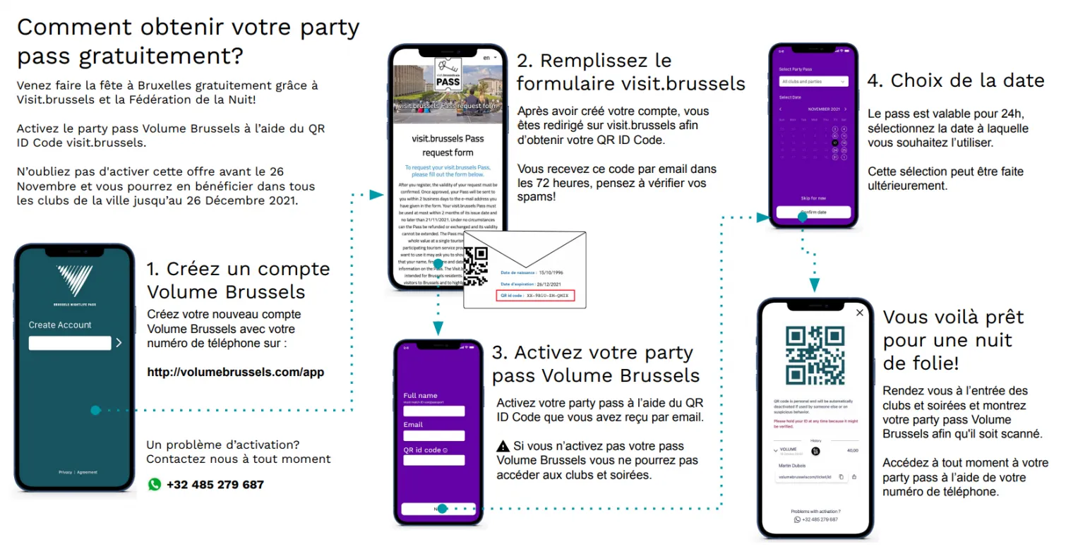 Il s’agit d’une offre touristique, culturelle, pouvant être utilisé dans les hôtels, chambres d’hôtes, auberges de jeunesse, musées mais aussi, vous l’avez compris, dans 8 institutions clubbing bruxelloises comme le Mirano, la Cabane ou le mythique Fuse ! Pour le décrocher, il suffit de le commander via le site volumebrussels.com. Un QR code vous est ensuite envoyé. Ou via ce lien si vous souhaitez obtenir d'autres offres culturelles.