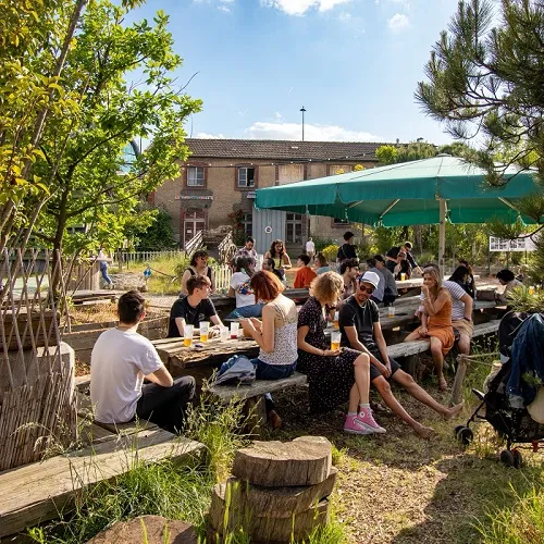 Comme un air de campagne en arrivant sur place. La Cité Fertile s’étend sur un hectare où l’on découvre à l’entrée des terrains de pétanques et plusieurs spots pour boire un verre. En voyant au loin son potager, sa serre ou encore ses bassins d’eau de pluie, on comprend rapidement que le lieu est dédié à la transition écologique.