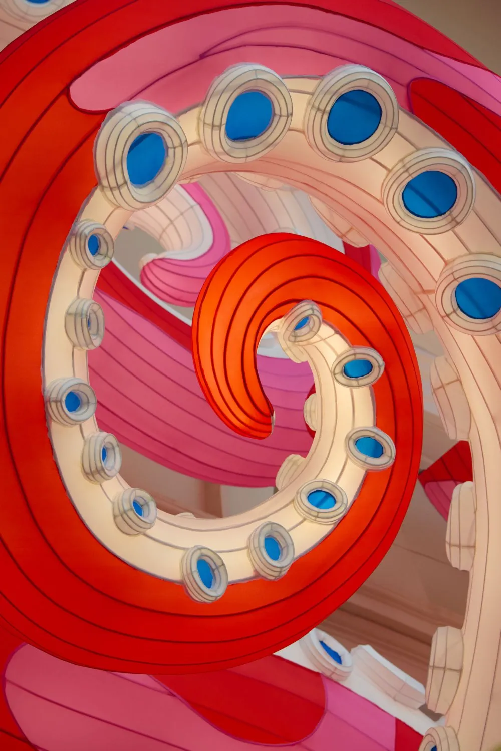 Sous la verrière parisienne, Murakami déploie son génie avec une installation absolument spectaculaire : une pieuvre-lanterne monumentale de huit mètres de haut. Plus qu'une œuvre, c'est une apparition. Inspirée des lanternes chinoises, cette pieuvre déploie ses tentacules kaléidoscopiques, transformant le Balcon d’Honneur en un univers onirique, presque psychédélique. L'animal, totémique dans l'art nippon, se mue ici en créature bienveillante, vibrante de lumière et de joie. Sa tête, constellée des célèbres Jellyfish Eyes, est une invitation hypnotique à plonger dans l'imaginaire Superflat de l'artiste.