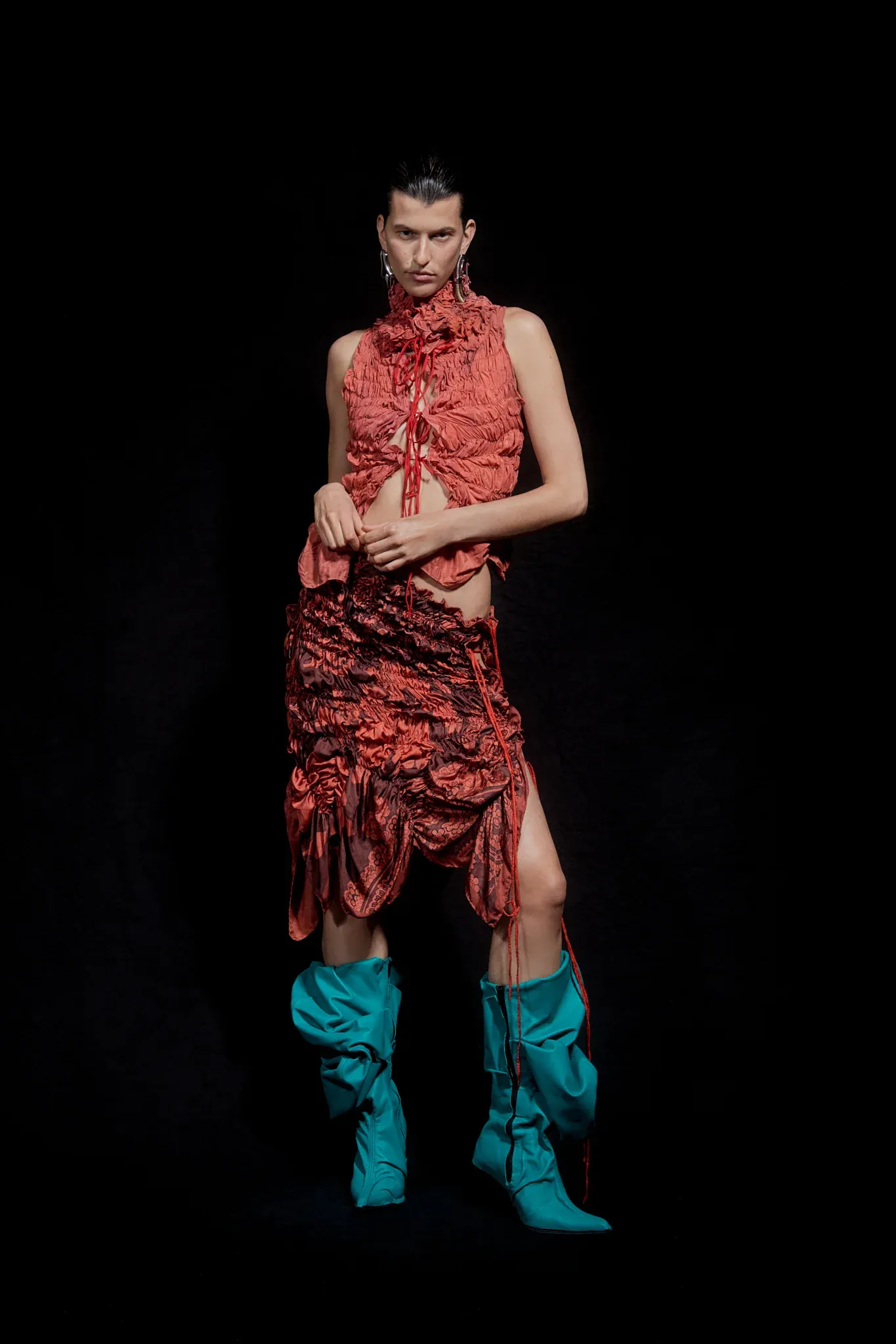 Chaque tenue est confectionnée à partir de tissus recyclés, notamment des vestes de costume, des t-shirts vintages, des foulards en soie plissés, des bas de nylon invendus et même des morceaux de câbles mis au rebut. Le liséré désormais signature de Laura Gerte ajoute la touche finale, créant une interaction unique de volume et de forme.