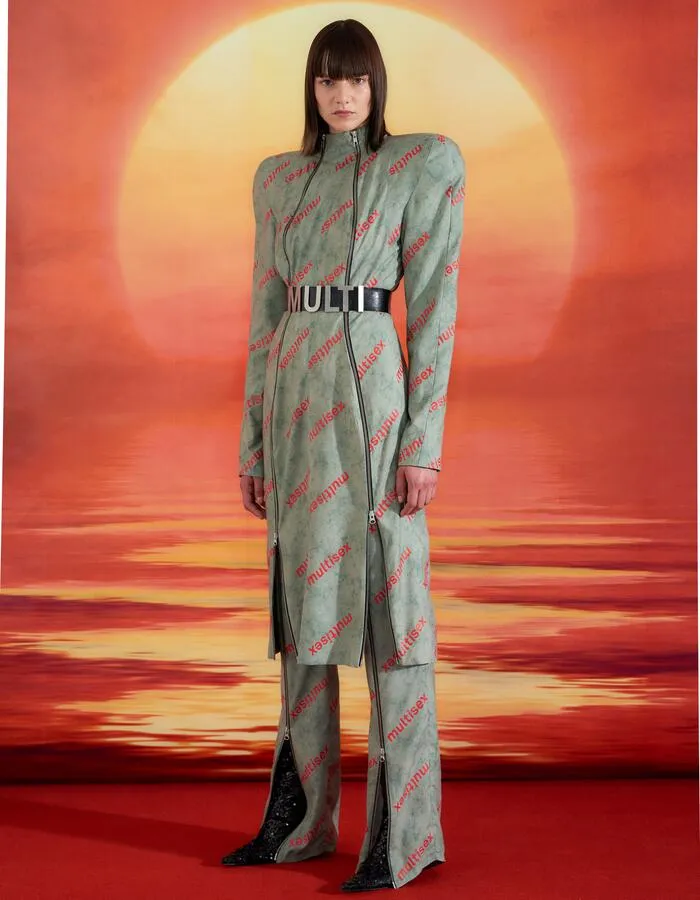 Les deux œuvres évoquent l’union des humains et des machines et repensent les notions fondamentales d’identité, de genre et de technologie. La collection ausculte l’abrogation de ces confins, signifiée par des variations des volumes et des matières : des coupages nets et des pièces féminines et plaisantes rejoignent des modelés vastes et volumineux, tandis que des vêtements d'extérieur résistants sont assemblés à des éléments délicats et fragiles.