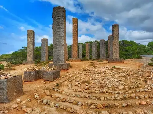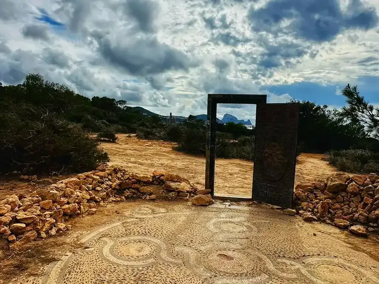 Les deux gigantesques portes se font face, fabriquées en bois et façonnées de ravissantes gravures arabiques, elles évoquent une petite salle carrée sans murs, une œuvre d'art imprégnée d’étrangeté et à découvrir entre les plages de Cala Codolar et Cala Llentia.