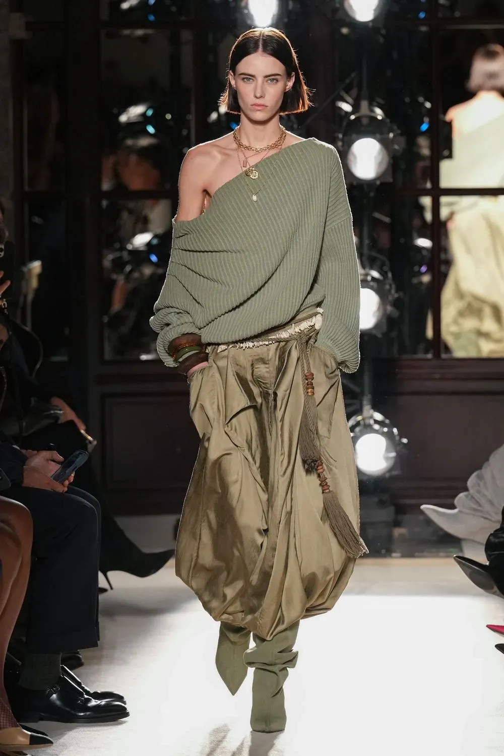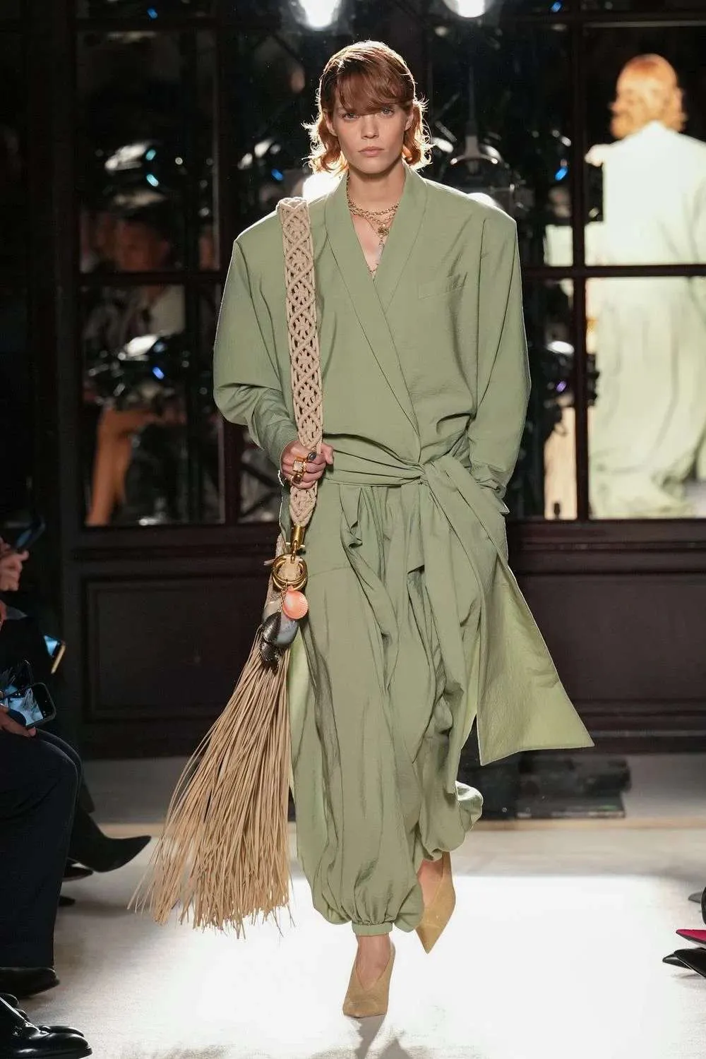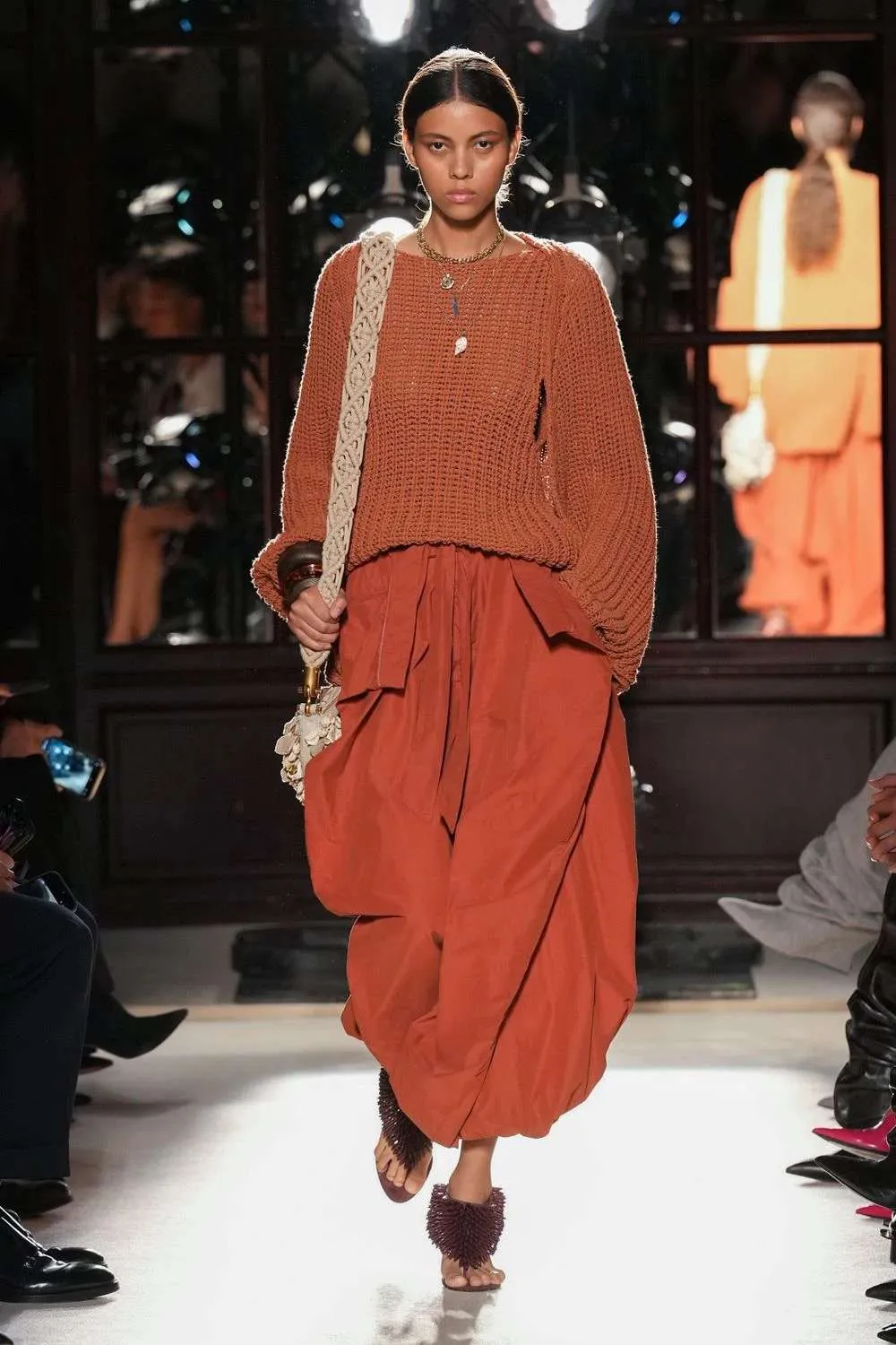 Tel un écho vibrant à la dernière partition de Stella McCartney, le podium a été le théâtre d'une dualité stylistique fascinante. L'opulence maîtrisée rencontre l'évasion : les silhouettes utilitaires — blousons oversize structurés, sarouels amples, pantalons cargo et shorts multipoches audacieux — se marient à des sommets d'une légèreté éthérée. Pensez mousseline drapée, maille nouée sophistiquée et ces tops qui semblent avoir été sculptés dans la matière même de l'océan, les coquillages.