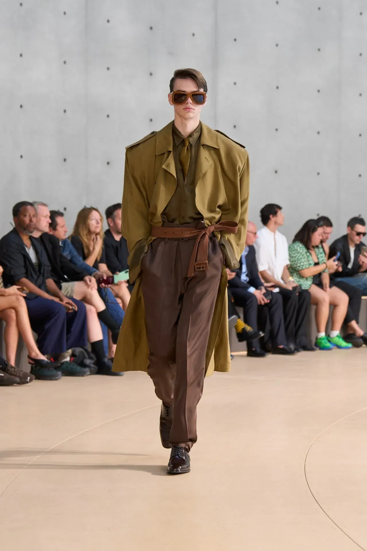 Au-delà des couleurs, Vaccarello impose avec rigueur et assurance une silhouette forte : mini-shorts marron foncé à revers coupés comme des pantalons de ville plissés, pantalons fluides à taille froncée, chemises aux épaules rembourrées, trenchs souples mais impeccablement nets. Cette répétition des formes crée un effet hypnotique, une harmonie visuelle qui ne laisse personne indifférent.