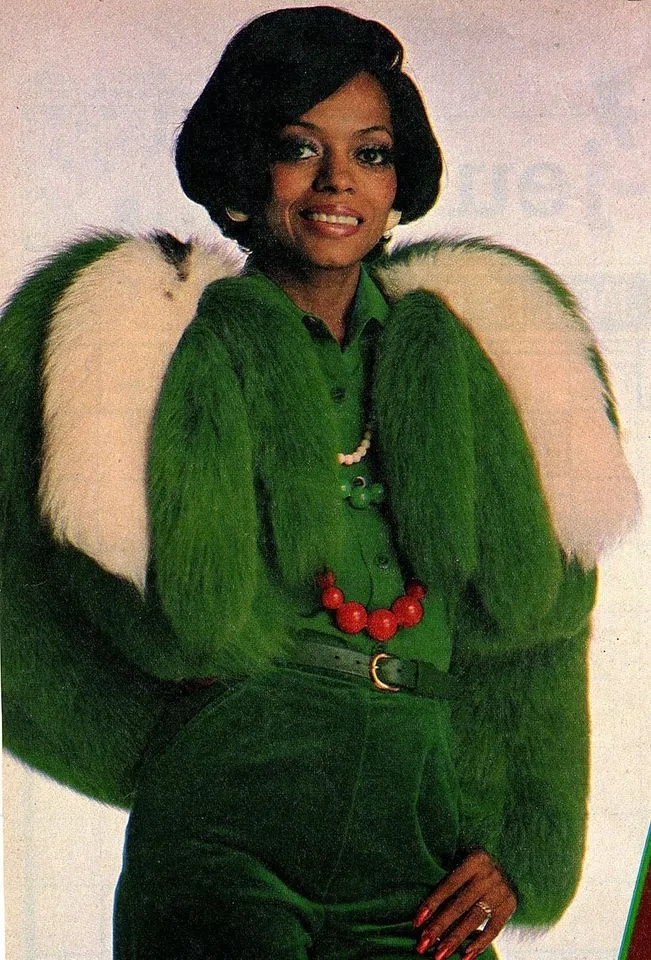 Diana Ross a toujours affirmé par son allure son amour pour Saint Laurent. En 1960, Elle devient une figure légendaire du label Motown et se révèle comme la chanteuse du groupe The Supremes. Elle poursuit son destin en solo, avec un premier tube, « Ain’t No Mountain High Enough » (écrite dès 1966 par Ashford & Simpson, popularisée l’année suivante par Marvin Gaye, avant que Diana Ross s’en empare en 1970). Elle noue avec les succès musicaux dans les années 1970 et 1980, mais aussi cinématographiques, comme dans le film Lady Sings the Blues de 1972 où elle incarne la chanteuse Billie Holiday