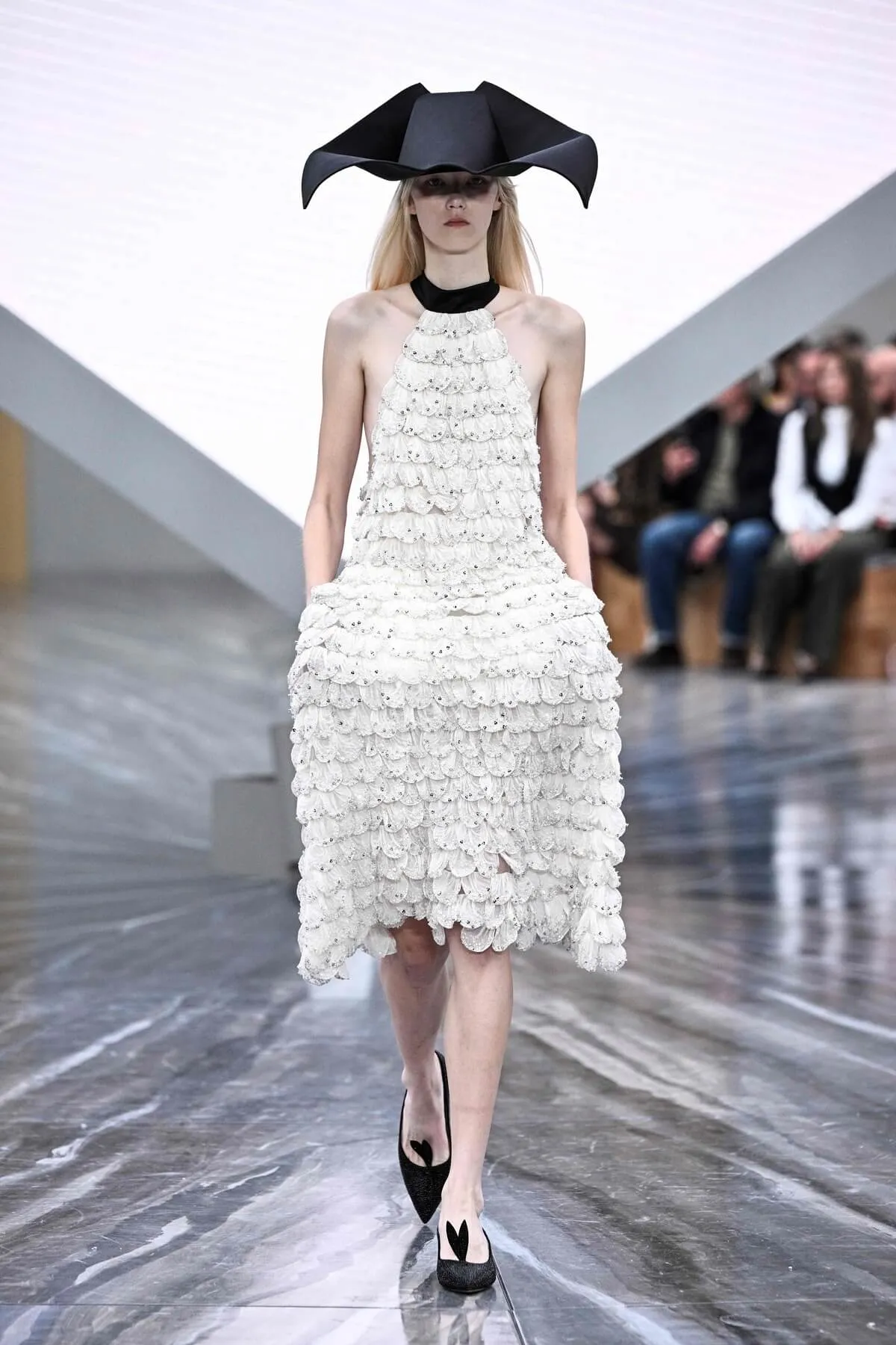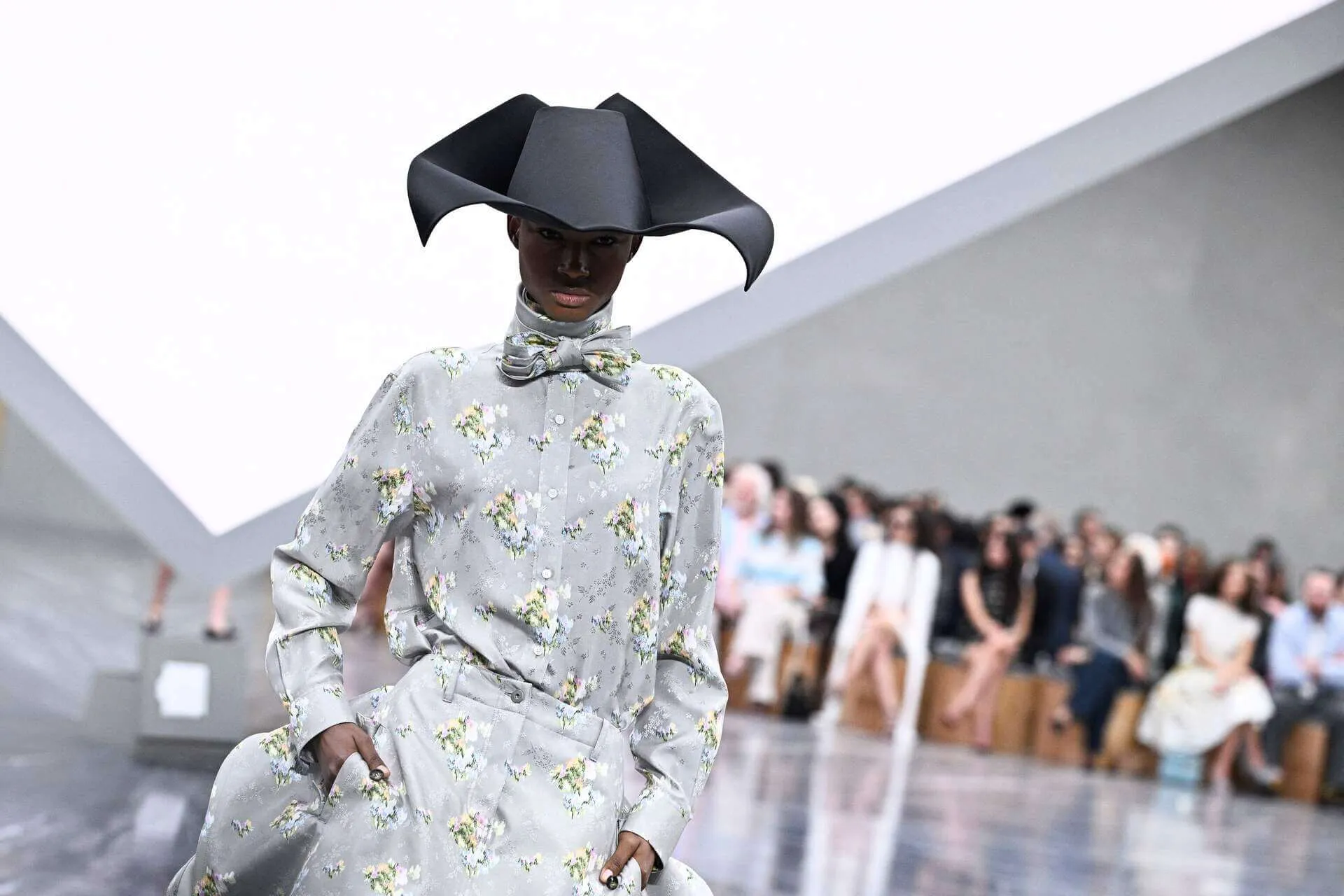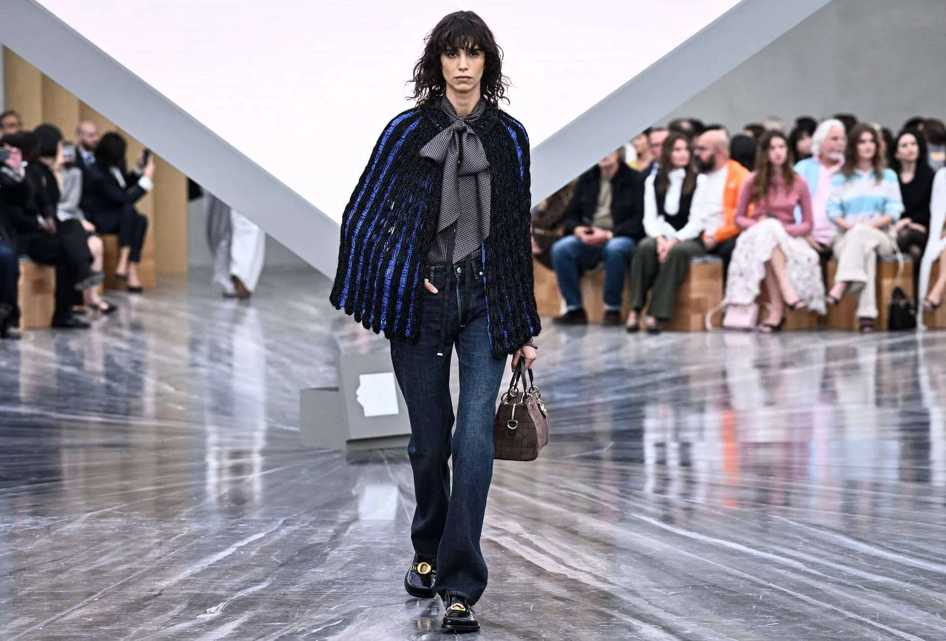 L'espace s'est vu métamorphosé par un décor spectaculaire : une pyramide inversée, suspendue au plafond tel un ovni sculptural. Tandis que les premiers rangs s'animent de conversations au sommet (Bernard Arnault avec Johnny Depp, Carla Bruni échangeant avec Brigitte Macron), on découvre la nature de ce tétraèdre mystique. Il sert d'écran multifaces, diffusant un clip signé par le documentariste britannique Adam Curtis, connu pour ses positions acérées contre l'Empire britannique, l'ère Thatcher, et son travail critique sur les élites. Le décor est planté, le défilé-manifeste peut commencer.