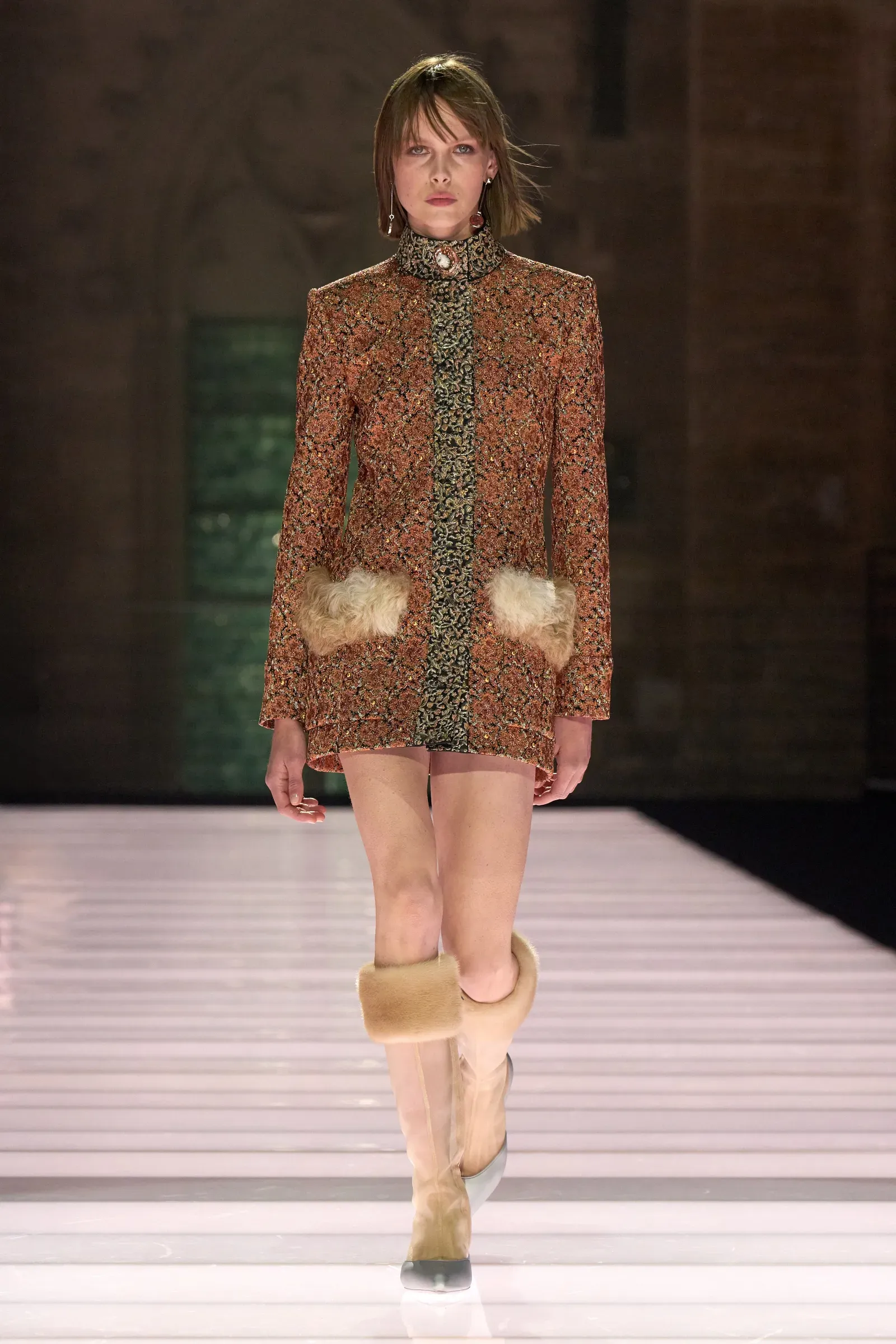 Louis Vuitton fait son show. Pour sa collection Croisière 2026, Nicolas Ghesquière jette son dévolu sur la célèbre Cours d’honneur du Palais des Papes d'Avignon. Un lieu profondément ancré, vibrant pour les fervents du théâtre, une estrade cernée par la beauté tactile des pierres médiévales. Dès le début, Nicolas Ghesquière fait référence à Jean Vilar, acteur essentiel du théâtre hexagonal, révolutionnaire dans son approche de la mise en scène et initiateur, en 1947, du Festival d'Avignon : “J’aime la vision révolutionnaire et volontaire de Jean Vilar qui débarque avec sa bande d’amis, de comédiens comme Gérard Philipe et Jeanne Moreau et dit : “C’est impossible de faire du théâtre ici, alors faisons-le.” Ici, l'art se manifeste dans sa forme la plus authentique, la scène est mise à l'honneur.