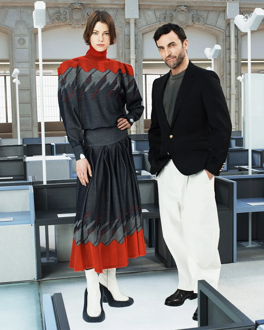 Défilé Femme Automne-Hiver 2025. Le directeur artistique des collections femme Nicolas Ghesquière a été photographié aux côtés du mannequin Dana Smith lors de la présentation de sa nouvelle collection dans le bâtiment de l'Étoile du Nord, datant du XIXe siècle, à Paris.