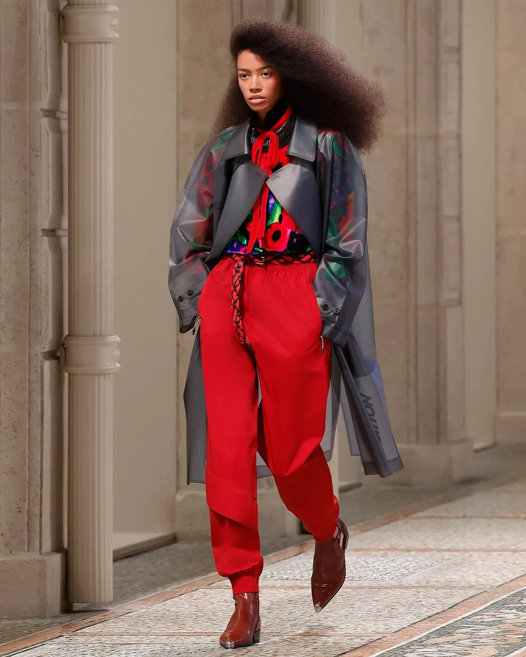 Défilé Femme Automne-Hiver 2025. Captant l’attention avec sa palette audacieuse, la première tenue de Nicolas Ghesquière est illuminée par un jeu de lumières théâtral – la teinte rouge vibrante transperçant le trench-coat translucide.