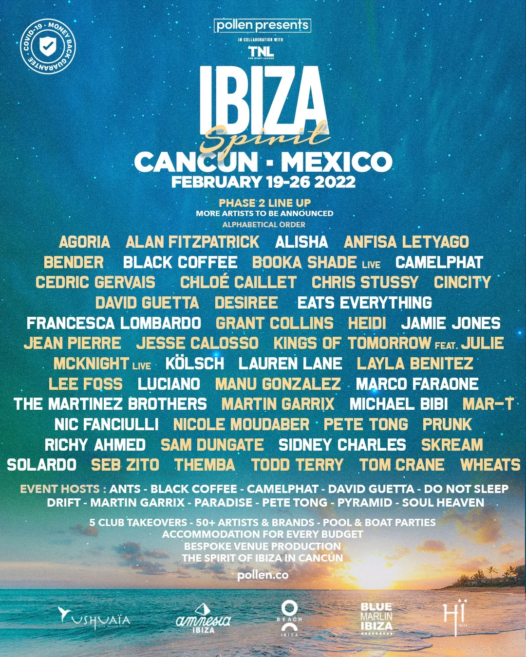 L'évènement Ibiza Spirit aura lieu du 19 au 26 février 2022 à Cancun au Mexique. Différents clubs ainsi que des pool parties qui vont accueillir de nombreux DJs parmi lesquels David Guetta, Black Coffee, Martin Garrix, CamelPhat, Nic Fanciulli, Cédric Gervais, Agoria, Solardo, Pete Tong et bien d'autres...