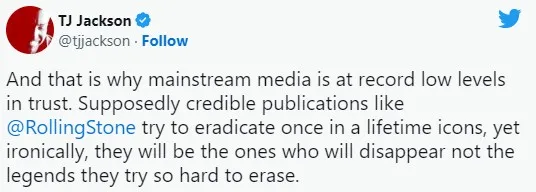 L’autre point qui a interpellé la toile est le classement de Michael Jackson à la 86ème place, une place trop faible pour de nombreux internautes, mais aussi la famille du roi de la pop comme TJ Jackson, le neveu de la légende qui s’est emporté en écrivant : « Rolling Stone Magazine essaye d’effacer des icônes ».