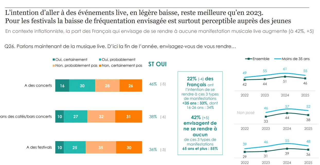 Alors que l’on vient de rentrer dans la pleine saison estivale avec son lot de concerts, festivals et autre open air en tout genre, cette étude observe une légère baisse sur l’intention des Français à se rendre à des événements musicaux. Près d’une personne sur deux (46%) compte se rendre à un concert et 36% à un festival.