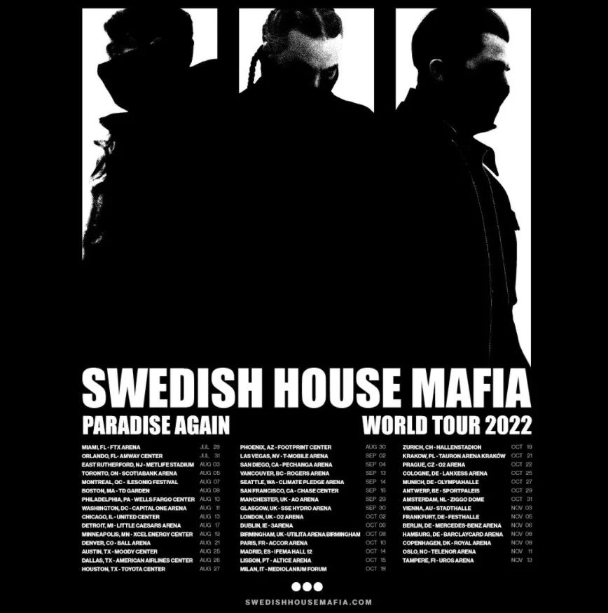 Et dans la foulée ils annoncent à présent une énorme tournée mondiale Paradise Again ! 44 dates composent pour le moment ce 'Paradise Again' qui débutera le 29 Juillet à Miami aux Etats-Unis. Un été totalement américain et canadien avant que la Swedish House Mafia ne débarque en Europe en octobre 2022 avec notamment une date à l'Accor Arena de Paris le 10 octobre.