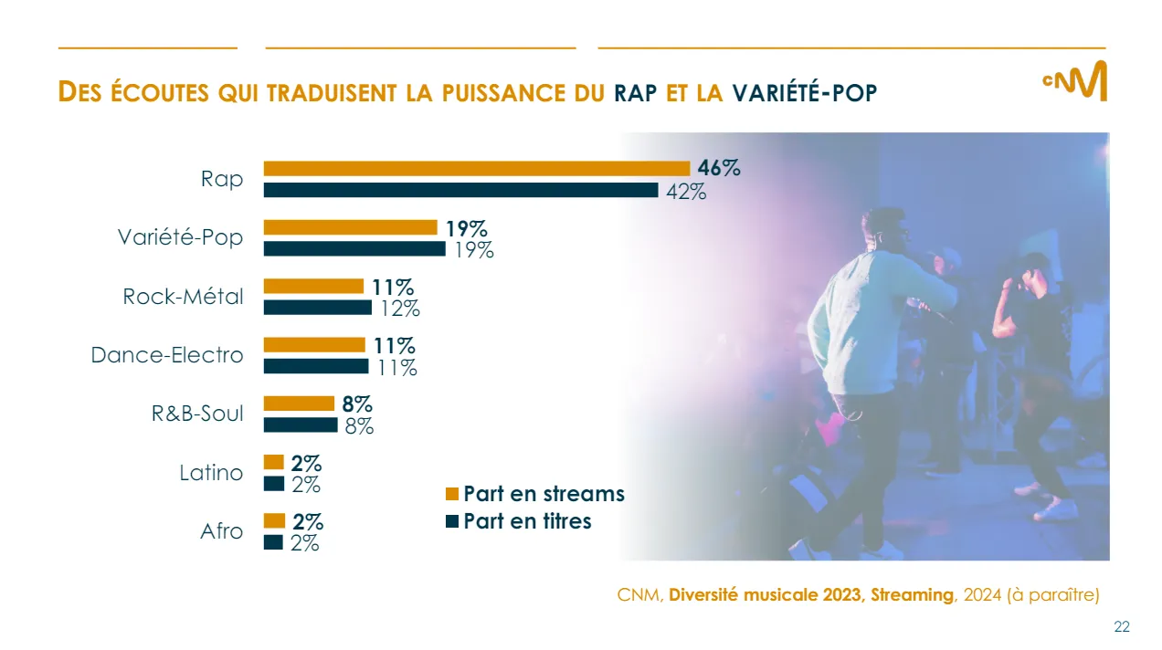 Parmi ces écoutes, il faut noter la toute-puissance du rap qui arrive largement en tête avec 46% des part de streams, la variété-pop arrive en seconde position avec 19% d’écoute, le rock et l’électro sont à égalité à la 3ème place avec 11% de streams.