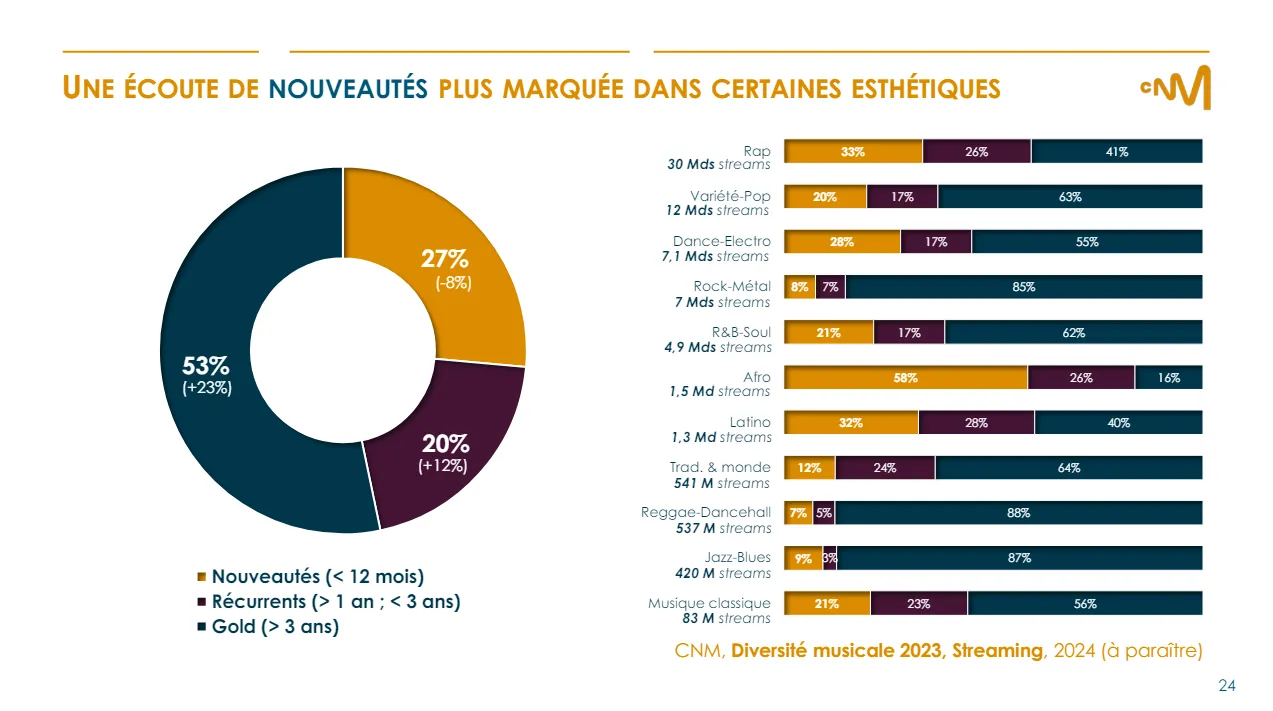 La nouveauté musicale n’est pas la même selon les styles musicaux, par exemple, les amateurs d’afro vont écouter 58% de nouveauté et 16% de gold (un titre qui a plus de 3 ans) alors qu’un fan de rock n’écoutera que 8% de nouveauté contre 85% de titres gold.