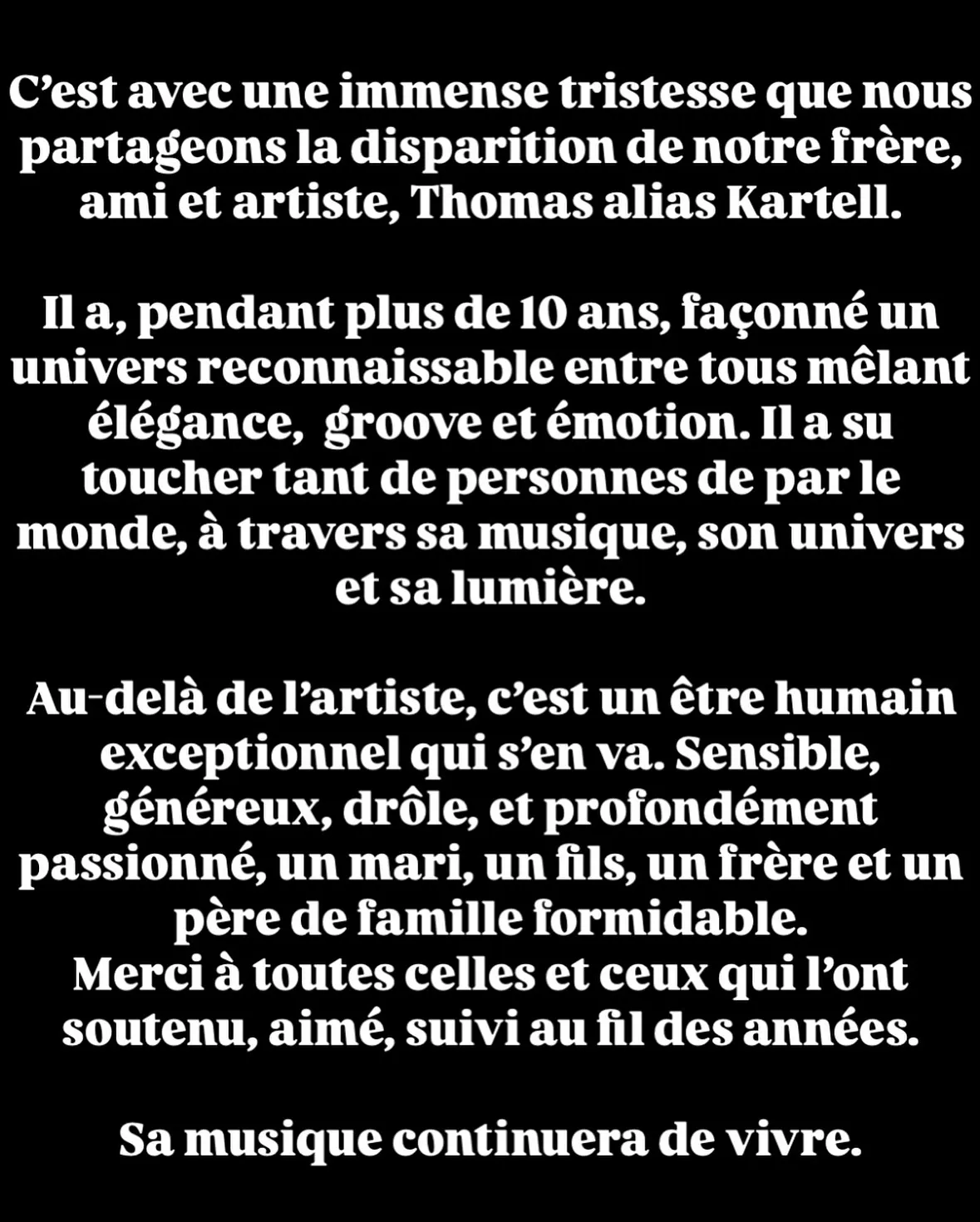 Il faisait donc partie de l’écurie Roche Musique, sur laquelle on retrouve d’autres belles signatures tricolores comme Darius, Cezaire, Zimmer ou l’excellent FKJ. Jeune producteur, Kartell avait déjà une belle discographie à son actif, son dernier single « Too Much On The Same Things » datant de mai 2024.