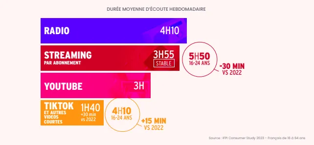 Et où cela se passe ? Radio et streaming sont toujours en tête des pratiques, même si c’est TikTok qui a le plus progressé en 2023. A propos de la plateforme chinoise, le SNEP nous donne quelques éléments. Ainsi, 1 jeune français sur 2 utilise Tiktok tous les jours (21% seulement pour les plus âgés) et 73% y font des découvertes musicales. Mais attention, la fréquentation de Tiktok se fait de plus en plus, au détriment d’autres plateformes, comme Spotify. Ce qui signifie qu'une part croissante du public découvre, écoute des oeuvres uniquement sur Tiktok. Oeuvres raccourcies, parfois modifiées sans l'accord des artistes.
