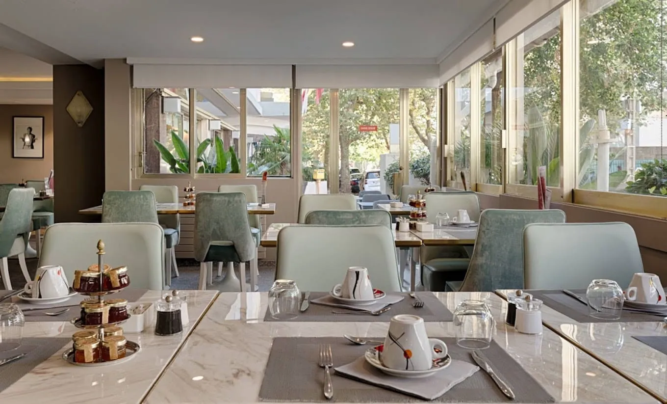 Dans la famille des Juliana Hotels, après Paris et Bruxelles, je demande Cannes. La Croisette est juste à côté. D’ailleurs, on peut même la rejoindre par un tunnel secret ! Un esprit Pierre Cardin souffle dès l’entrée : le ton est donné d’une déco très gaie, décomplexée, où dominent les bleus et les blancs. Et les clins d’œil aux Sixties et aux Seventies se poursuivent au gré des 165 chambres et suites. Des papiers peints géométriques, parfois un poil psychédéliques, réalisés par Wall and Deco et des meubles qui rappellent ceux de la Maison Jansen ou de Willy Rizzo. Ajoutez une salle de fitness et la petite piscine avec solarium dissimulée à l’arrière de l’établissement, un bar et une salle de restaurant qui se pique de sofas jaune ensoleillé et, cerise sur les tartines du matin, l’hôtel produit son propre miel. D’ailleurs, les ruches sont sur le toit de ce 4 étoiles sans prétention mais diablement sympathique.