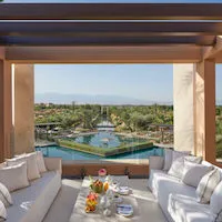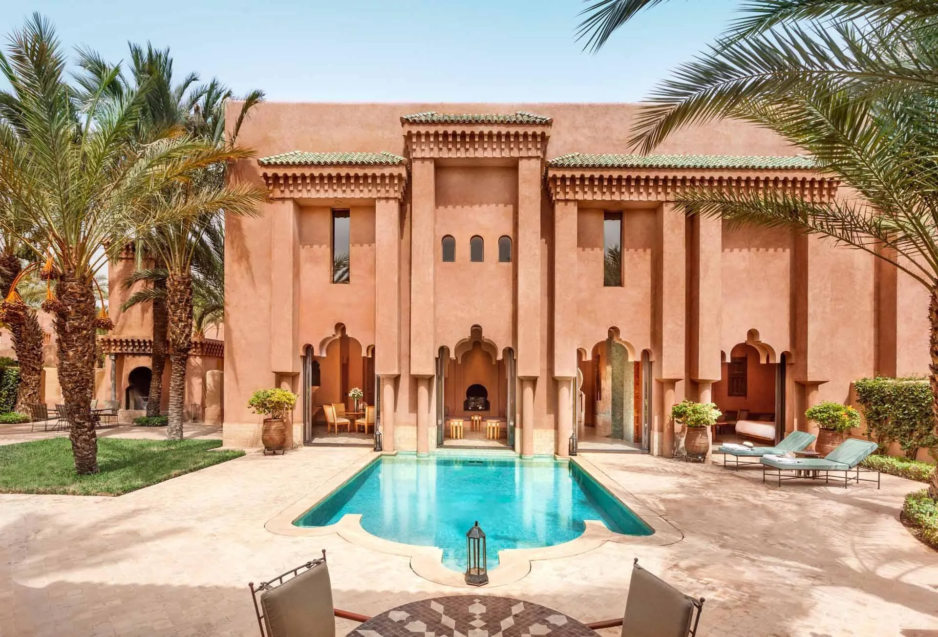 Véritable bijou architectural plongé dans 5 hectares de jardins conçus tout en perspectives, plantés de fleurs et de palmiers, parsemés de bassins et de fontaines qui bruissent dans la brise tiède, l’Amanjena évoque un palais de conte oriental. Hauts murs de pisé ocre, colonnes élancées, arches majestueuses et toitures de tuiles vernissées… Signés par l’architecte Ed Tuttle, les élégants bâtiments de ce 5 étoiles rendent hommage aux remparts de Marrakech, comme ils célèbrent les lieux les plus emblématiques de la Ville Rouge : les jardins de la Ménara, les mausolée saadiens ou le Palais de la Bahia. On n’y trouve pas de chambres, mais des pavillons incroyablement spacieux qui invitent à se détendre dans une ambiance Art déco orientale avec des murs de pisé, plafonds voûtés, tomettes vernissées et tissus brodés de motifs traditionnels. Chaque pavillon dispose d’un patio orné d’un bassin, ainsi que d’une terrasse tournée vers les jardins ou les montagnes de l’Atlas. L’Amanjena est un sanctuaire, un havre de plénitude où l’on peut se ressourcer pleinement, et ce notamment au Spa qui combine, dans un décor somptueux, le meilleur des traditions asiatiques et maghrébines…