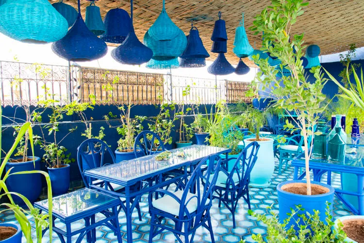 Après avoir fait défiler sa marque de prêt-à-porter et créé sa propre agence de décoration et de design, Stella Cadente a choisi d’ouvrir un riad à Marrakech, une ville qu’elle affectionne au point d’avoir choisi d’y habiter. Mignon comme une bonbonnière au patio de poupée bleuté, ce boutique-hôtel évoque à merveille l’univers onirique de la créatrice, à la fois plein de charme et haut en couleurs. En dehors de quelques meubles chinés, tout a été dessiné par la styliste et fabriqué sur-mesure par les meilleurs artisans de Fès et de Marrakech : jetées de lits, coussins brodés et vasques en cuivre martelé, tapis, céramiques et luminaires en doum. L’hôtel signature de Stella est un véritable hommage à l’artisanat marocain… Douée pour capter les tendances et sublimer les couleurs, cette dernière a imaginé pour ses sept chambres un décor teinté de baroque et d’exotisme. Un paon doré qui fait la roue en guise de tête de lit, une oasis de palmiers pour se lever de bonne humeur et une couronne d’étoiles pour mieux plonger dans le sommeil… L’imaginaire de la créatrice est foisonnant ! Heureusement pour ses fans, on peut retrouver toute la décoration de l’hôtel, les accessoires et collections de vêtements de la créatrice dans la boutique située au rez-de-chaussée : on peut ainsi prolonger les plaisirs de son séjour chez soi…