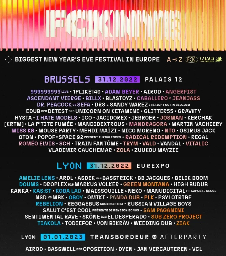 Chez nos amis belges, la fête va se passer du côté de la salle de concert du Palais 12 de Bruxelles avec le festival FCKNYE. C’est l’une des plus belles soirées du réveillon puisqu’on y retrouvera I Hate Models, Nico Moreno, Adam Beyer, NTO ou encore Vitalic.