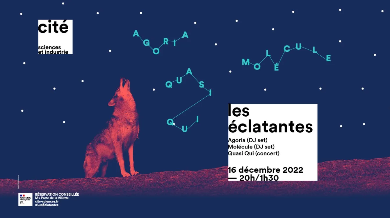 La Cité des Sciences et de l'Industrie va nous régaler aussi puisqu'elle est de retour avec son événement incontournables "Les éclantantes". Au programme : expo nocturne et concert avec ls londoniens de Quasi Qui, l'électro expérimentale de Molécule, et un DJ set exceptionnel de la légende de la techno française, Agoria.