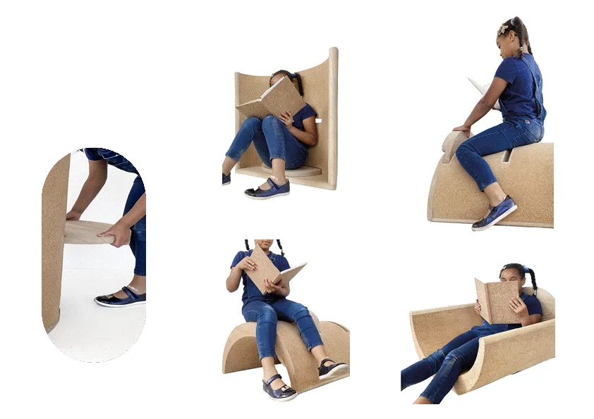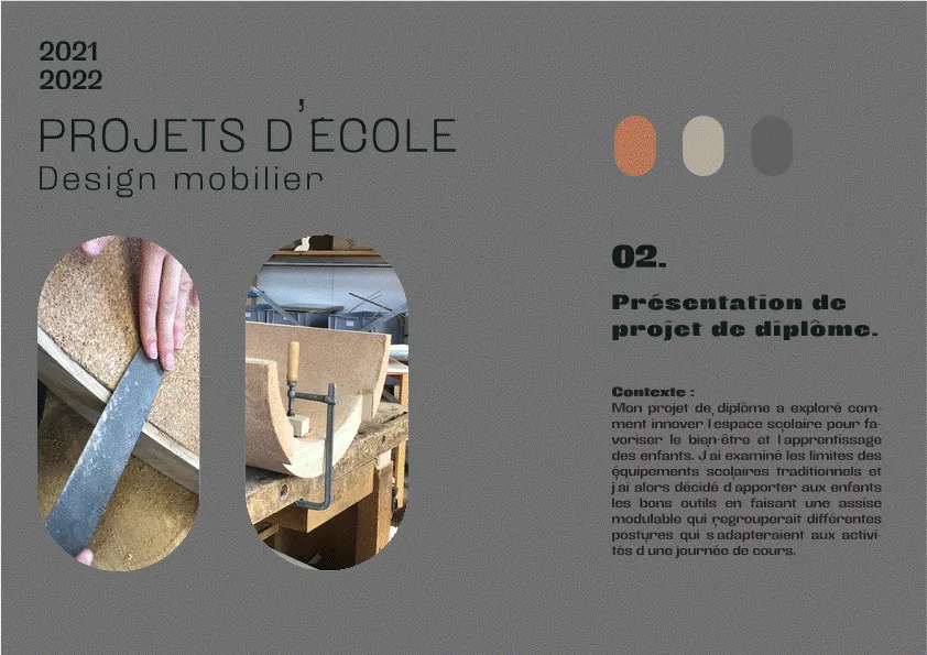 Pour son projet de diplôme, « Siéger à l’école », elle réimagine l'espace scolaire pour optimaliser le bien-être et l'apprentissage. Inspiré par des méthodes pédagogiques alternatives, elle conçoit un mobilier modulable en liège et en chêne. La coque en liège, avec son design elliptique, permet une grande flexibilité et peut être ajustée par les enfants, favorisant ainsi une utilisation dynamique et adaptée aux besoins individuels.