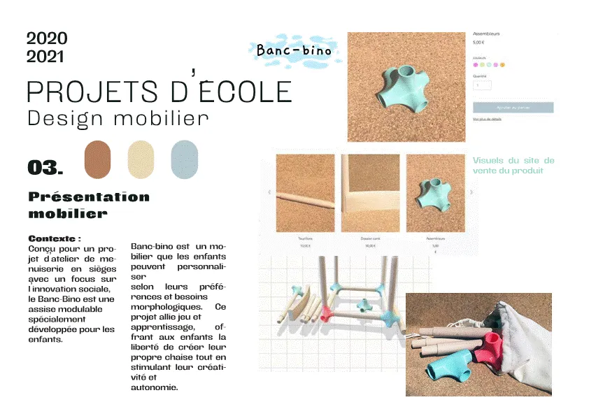 Elle a réalisé de nombreux projets axés sur l'innovation sociale. Parmi eux, le projet « Banc-bino » en deuxième année. Banc-bino est une chaise modulable pour enfants. Ce kit, compose d'assemblages imprimés en 3D colorés, permet aux enfants de personnaliser leur mobilier tout en favorisant l'acceptation des différences. Fabriquée en hêtre et contreplaqué, la chaise se distingue par sa modularité, offrant un assemblage ajustable et interactif.