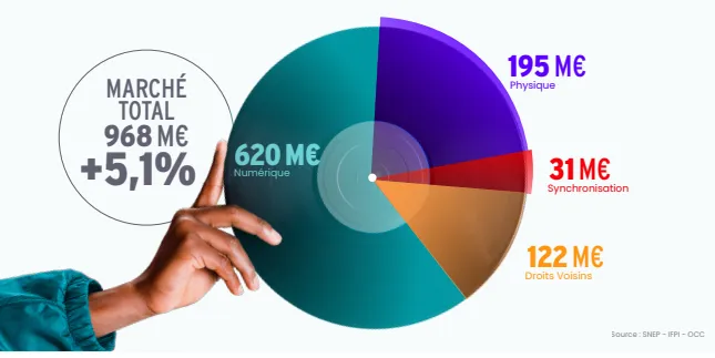 Pour la 7ème année consécutive, le marché français de la musique progresse et affiche en 2023 un chiffre d’affaires de 968 millions d’euros, en hausse de 5,1%. Sans surprise, c’est le streaming qui porte les acteurs de la musique (il représente les 3 quarts des revenus), les ventes physiques restant stables (les CDs représentant 12% des revenus globaux, 12% pour les vinyles).