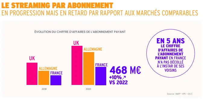 Deuxième bémol émis par le SNEP, les revenus liés au streaming progressent en un an de 10%, mais c’est trop faible pour accompagner le développement nécessaire du marché musical. Pire, le streaming semble atteindre un pic alors qu’il n’y a que 12 millions d’abonnements en France aux plateformes type Spotify. Le développement et l’expansion du streaming payant deviennent donc une priorité pour la filière musicale, d’autant plus que la France n’a pas connu d’explosion des revenus comme nos voisins anglais ou allemand.