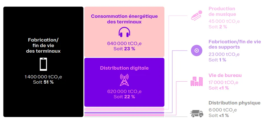 Du coup, des données ont été collectées auprès d’une quarantaine de structures, labels, entreprises de fabrication de vinyles et autres studios de musique. Bilan : les émissions du secteur de la musique sont estimées à 2 780 kilotonnes équivalent carbone (2 780 ktCO2e) pour l’année 2022.