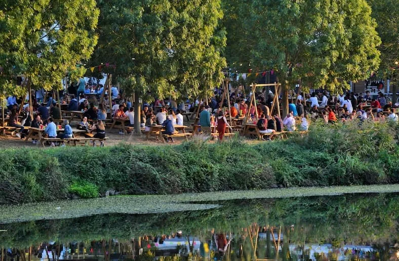 Dès les beaux jours, les guinguettes fleurissent dans Rennes, au bord de l’eau, dans d’anciennes fermes ou dans les parcs. De grandes terrasses se déploient alors pour prendre un verre et du bon temps, manger un morceau ou assister à un concert. Comme vous pouvez l’imaginer, les bonnes adresses ne manquent pas ! On peut depuis quelques années s’installer sur les fauteuils en bois multicolore d’Origines, un lieu hybride étonnant, à la fois bistrot et microbrasserie, installé dans le cadre ultra classique de l’ancien hôpital et maternité de l’Hôtel-Dieu. On apprécie la street food bien travaillée, comme la bière brassée sur place, dans un ancien bloc opératoire ! Ambiance toute aussi sympa et atypique sur les rives de la Vilaine où se trouve le MeM, LA guinguette rennaise par excellence. Située en bordure d’un chemin de halage, juste à côté d’un chapiteau de velours qui accueille spectacles et concerts, cette guinguette cultive l’art de la convivialité autour de plusieurs bars et d’un parquet en bois qui peut aussi bien faire office de scène que de dancefloor. Parfait pour un apéritif au coucher du soleil…