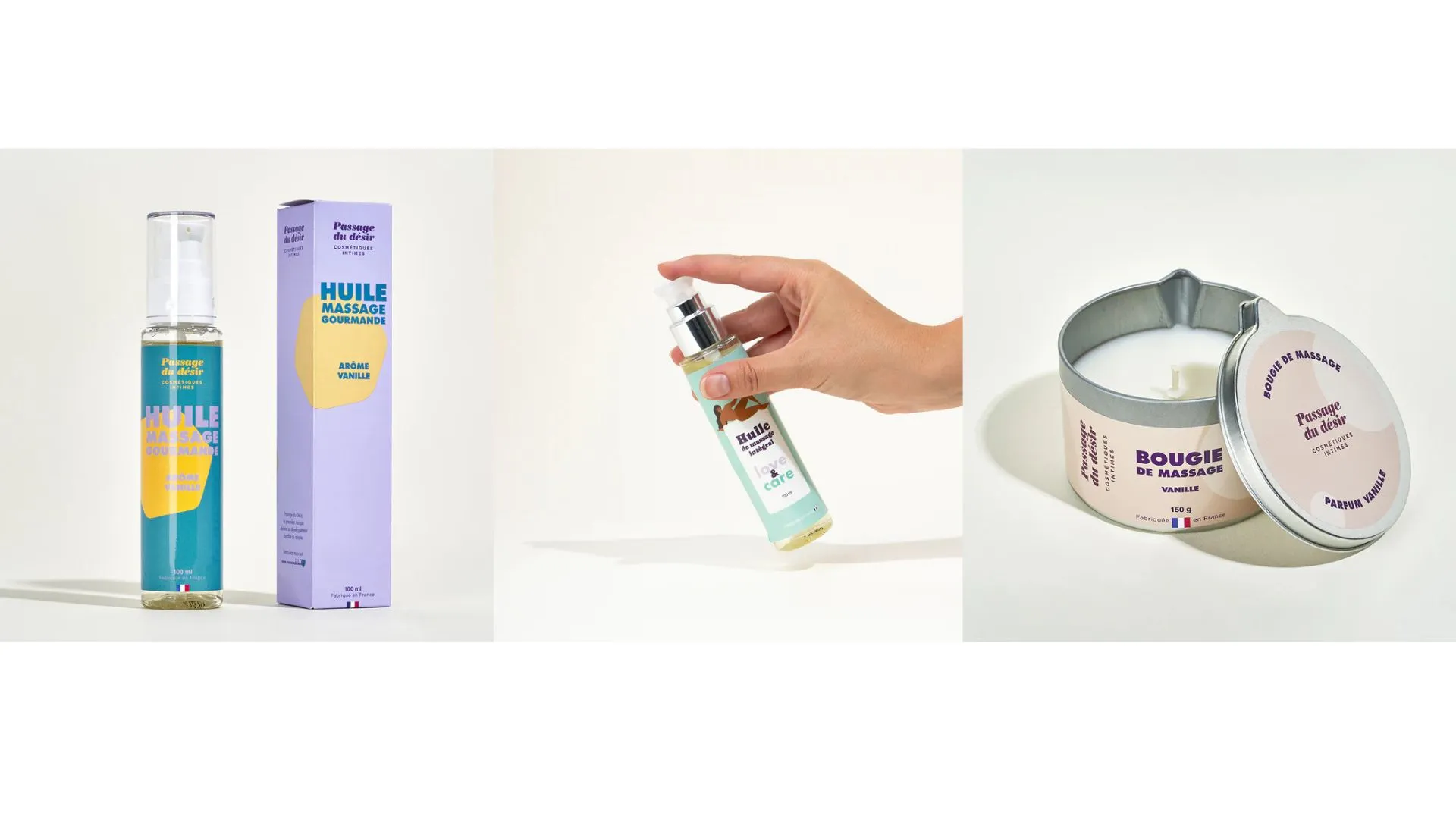 Deux huiles et une bougie de massage à la texture douce et parfumée de chez Passage du Désir et de chez Love and Care