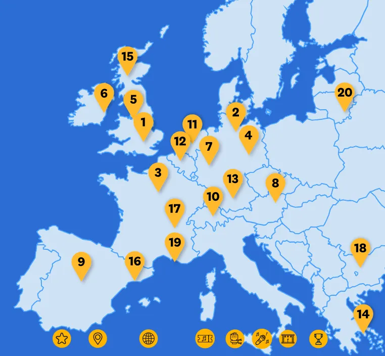 Des Beatles à Bowie en passant par les Daft Punk ou encore ABBA, de nombreuses légendes de la musique viennent d’Europe et chaque année, les villes européennes hébergent parmi les plus beaux événements musicaux du monde.