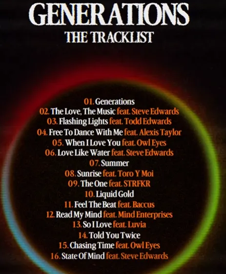 Generations est également une belle succession de collabs: Steve Edwards (sur Love Like Water ou le très bon The Love, The Music), Todd Edwards, cet ancien collaborateur des Daft Punk (sur Flashing Lights), Toro y Moi duo américain que l'on avait adoré sur le All ur Luv de Madeon ou encore Alexis Taylor, artiste britannique sur ce track vintage Free To Dance with Me.
