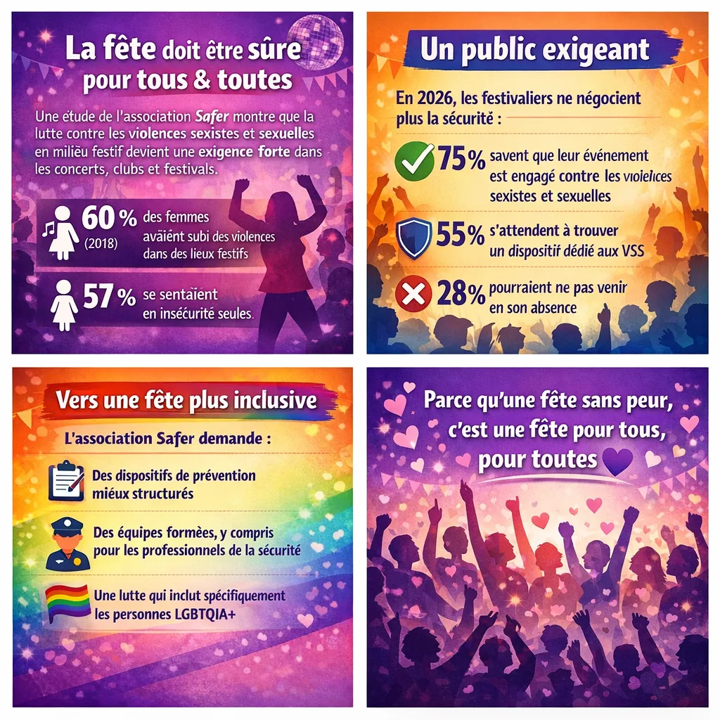 Pour une fête plus sûre. Voilà la démarche et le plaidoyer de l’association Safer qui vient de publier un livre blanc « État des lieux et perspectives de la lutte contre les violences sexistes et sexuelles en milieu festif”. Fruit de longs mois de travail, le document dresse un constat sans ambiguïté : la lutte contre les violences sexistes et sexuelles (VSS) est devenue une condition de crédibilité pour l’événementiel musical. Et là, on parle des concerts, festivals, clubs, bars, free parties ou encore soirées privées. En 2026 donc, la lutte contre les violences n'est plus un accessoire mais un impératif observé comme tel, par le public.