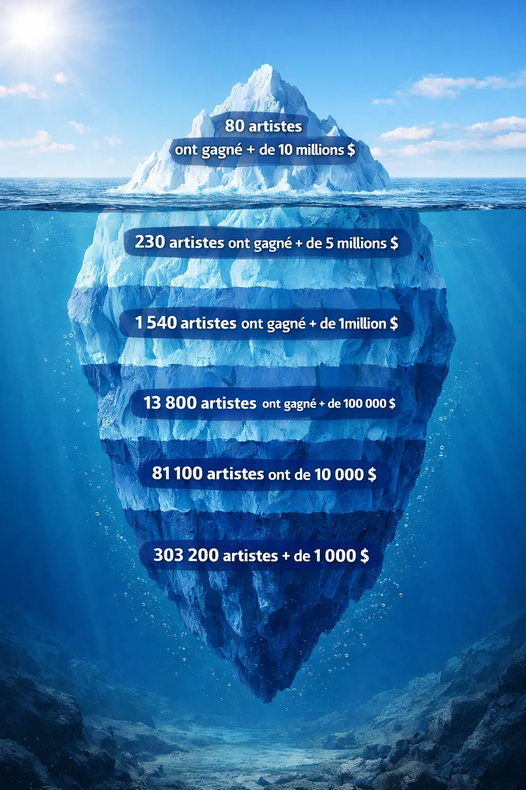 Ces chiffres illustrent l’ampleur prise par l’économie du streaming. Mais derrière ces succès spectaculaires se cache une pyramide beaucoup plus large — et beaucoup plus inégale. Feldup parlerait d’iceberg, alors plongeons !