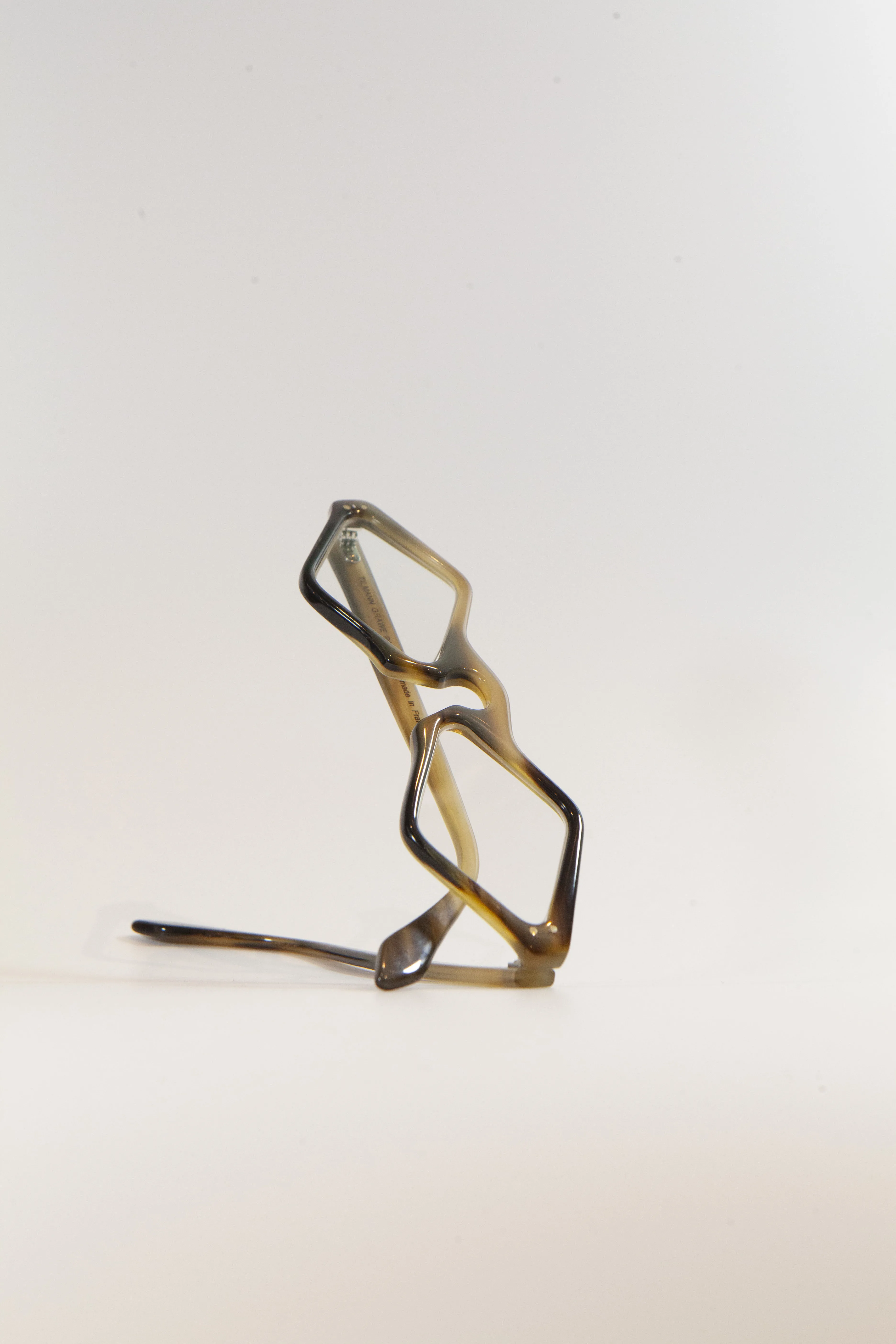 La palette des couleurs, pour les modèles en acétate, comprend le noir classique et l'écaille associés à des tons pop comme le rose et le bleu électrique, tandis que pour la corne de buffle, selon son essence, des teintes naturelles sont proposées. La forme de l'œil est le point de départ de la création du losange, et soudain les lunettes sont comme un cadre pour un tableau. La forme graphique frontale de la monture n'est rien d'autre que l'interprétation graphique déterminée par l'axe de l'œil. Légèrement incurvé, le devant épouse plus étroitement la courbe du visage, encadrant agréablement l'œil par son parallélisme et le regard avec lui, soulignant la personnalité de celui qui les porte.