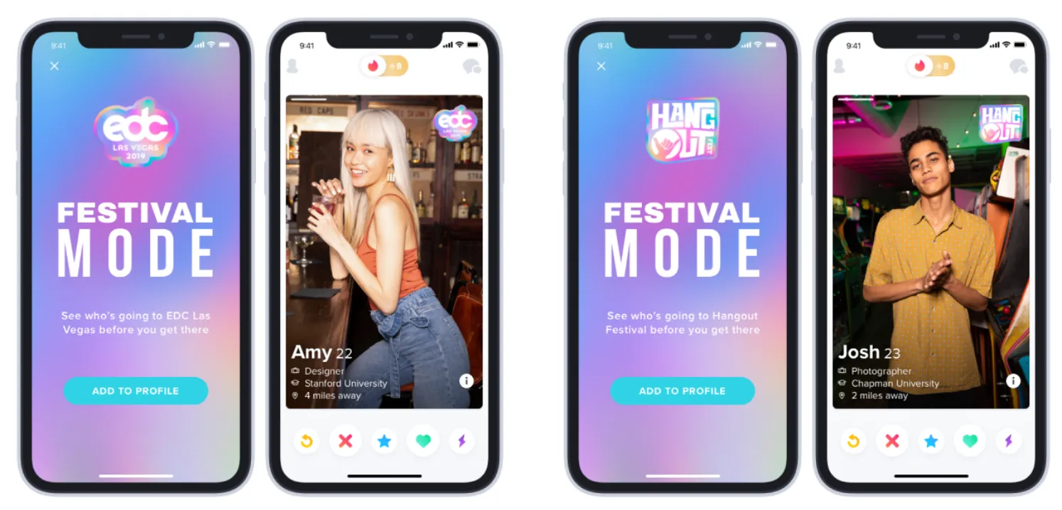 Pour Kyle Miller, le vice-président de Tinder : "Le mode Festival vous donne l’occasion de vous remettre en selle, de rencontrer de nouvelles personnes et de vous faire des amis avant de vous rendre sur les lieux du festival. C’est un excellent moyen, sans pression, de renouer des liens dans le monde réel.”