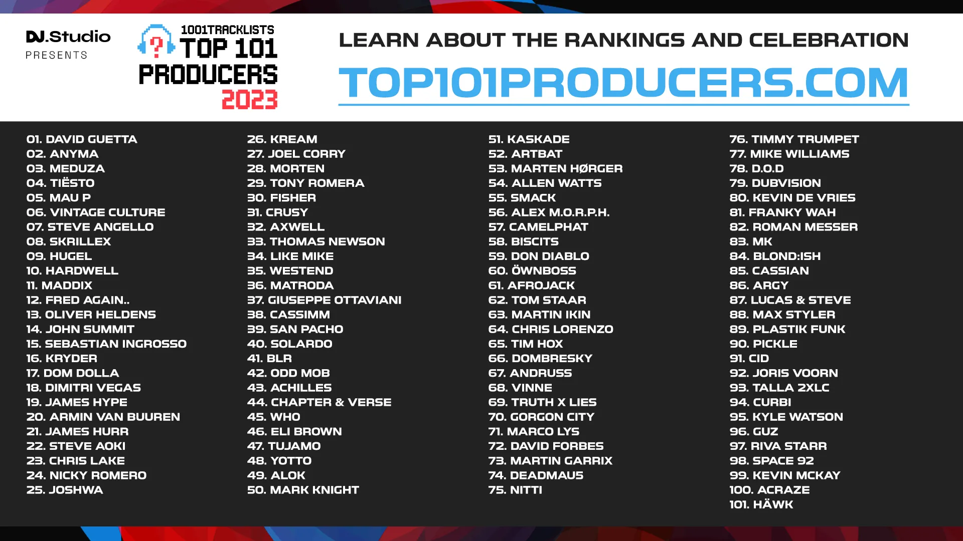 Déjà numéro un l’an dernier, David Guetta est de nouveau adoubé par ses pairs. Entre ses morceaux inédits et tous ses remixes à travers ses multiples alias, le producteur français a une nouvelle fois réalisé une année pleine. Et il se voit récompensé par cette prestigieuse première place dans ce très intéressant Top 101 Producers, établie par 1001Tracklists.