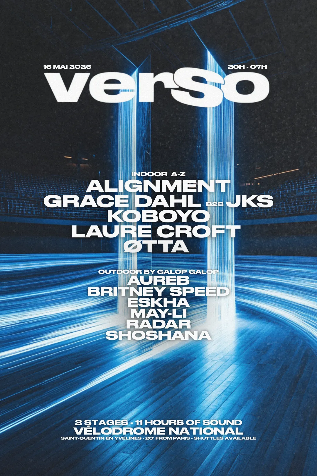 Verso Festival réunira plusieurs figures fortes de la techno sur une scène intérieure installée au cœur du Vélodrome National. Parmi les artistes annoncés : Alignment, JKS b2b Grace Dahl, Koboyo, Laure Croft et Otta, pour une programmation mêlant artistes internationaux et talents émergents. À l’extérieur, une seconde scène ouvrira dès 20h00 avec une programmation signée par le collectif Galop Galop. Elle permettra de prolonger l’expérience dans un cadre plus ouvert, entouré d’un village d’animations et d’un espace food court réunissant plusieurs stands food et drinks. L’objectif : créer un véritable lieu de vie où musique, rencontres et expériences se mêlent tout au long de la nuit.