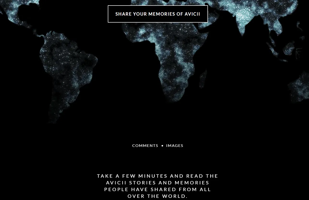Ses fans, ou même de simples amateurs de tracks d'Avicii, sont appelés à partager par écrit leurs souvenirs au moment d'évoquer la musique du l'artiste suédois. Les messages, venus du monde entier, sont ensuite publiés sur cette même page d’accueil et visibles par tous. Une autre belle façon de faire perdurer la mémoire d’Avicii...